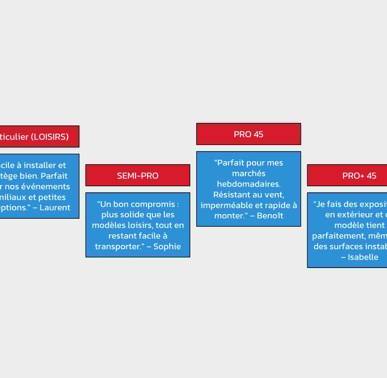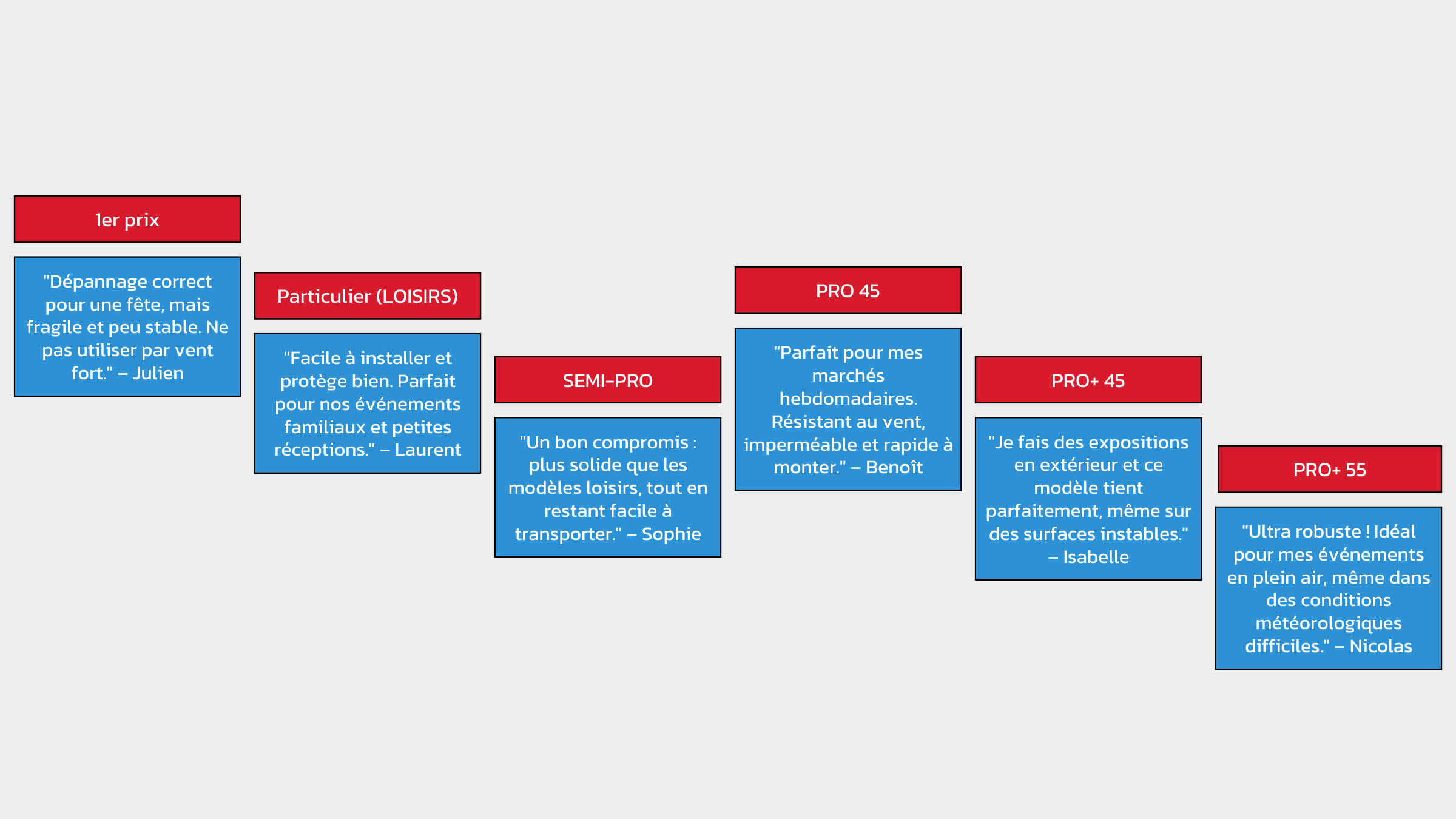 En revanche, les avis sur les chapiteaux 1er prix sont plus partagés. S’ils conviennent pour une utilisation ponctuelle, leur structure plus légère et leur durée de vie limitée sont souvent soulignées par les utilisateurs. Ceux qui recherchent une solution fiable pour un usage régulier s’orientent donc davantage vers des gammes plus robustes, offrant un meilleur investissement sur la durée.