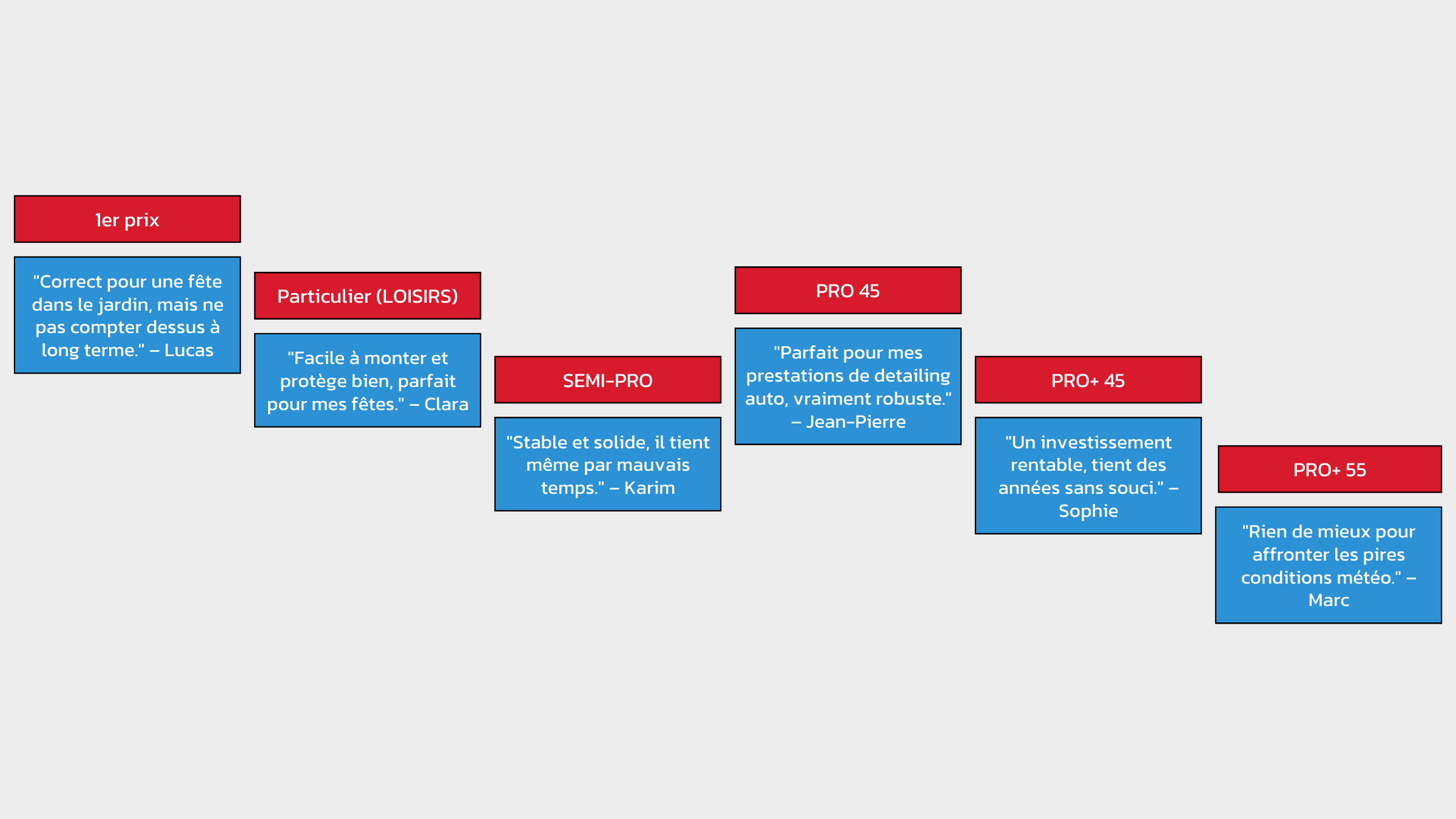 Prix : Le prix est un facteur déterminant pour les utilisateurs, et le barnum 1er prix est le plus abordable, rendant cette gamme accessible à ceux qui ont un budget limité. Cependant, ce faible coût se traduit par une durabilité et une performance moindres, il vaut mieux dans ce partir sur un barnum 3x3 particulier.