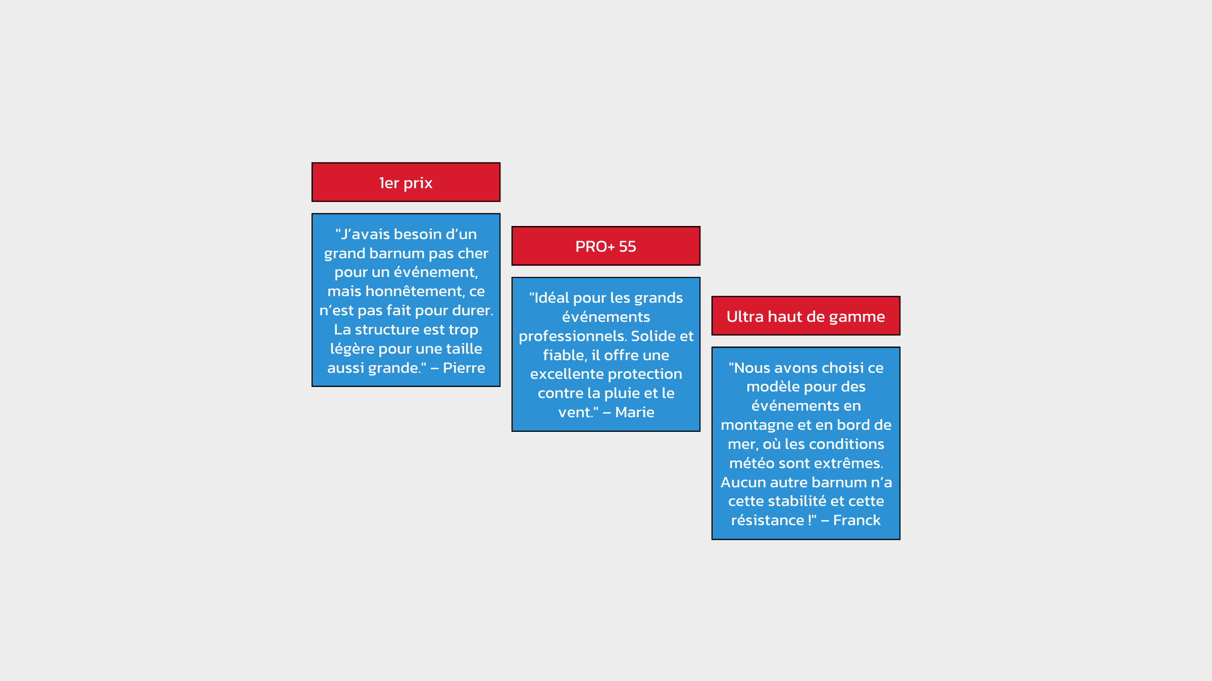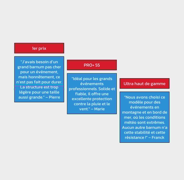 Le prix varie en fonction de la gamme, avec le barnum 1er prix offrant la solution la plus économique, bien que sa durabilité soit limitée. Le Pro+ premium est l'option la plus coûteuse, mais il justifie ce coût par une durabilité et une qualité supérieures.