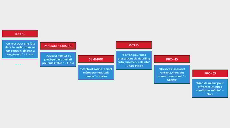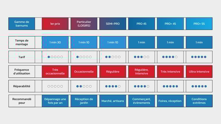 Prix : Le prix est un facteur déterminant pour les utilisateurs, et le barnum 1er prix est le plus abordable, rendant cette gamme accessible à ceux qui ont un budget limité. Cependant, ce faible coût se traduit par une durabilité et une performance moindres, il vaut mieux dans ce partir sur un barnum 3x3 particulier.